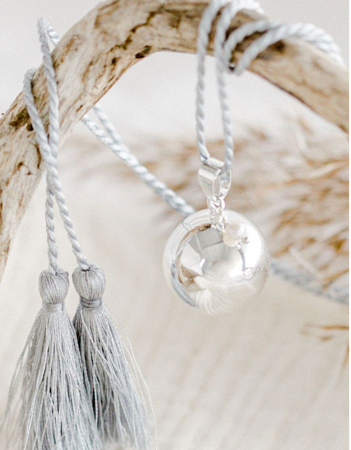 Le bola de grossesse lisse en argent Pernelle est à porter en pendentif grâce à son long cordon en soie coloris galet avec des pompons en finition, à porter derrière le cou ou suspendu à côté du bola, sur le ventre.