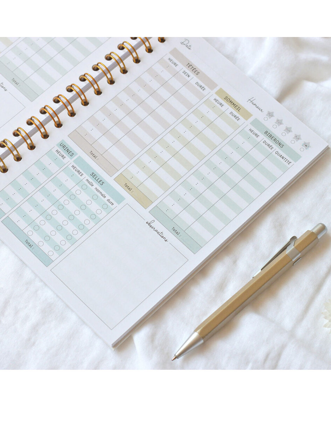 Une page dédiée par jour, reprenant la date, l'humeur et le poids de bébé. Quatre tableaux colorés permettent de noter l'heure de la dernière tétée et le sein utilisé, ou l'heure du dernier biberon, ainsi que les heures et commentaires sur le selles, urines et le sommeil. Toutes les données demandées par le personnel soignant pour parfaitement suivre l'évolution de bébé.
