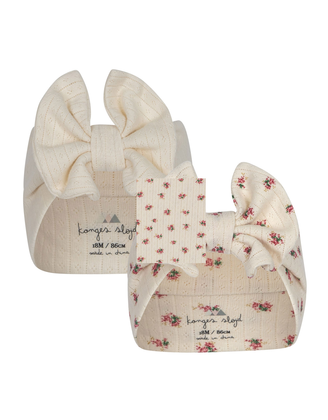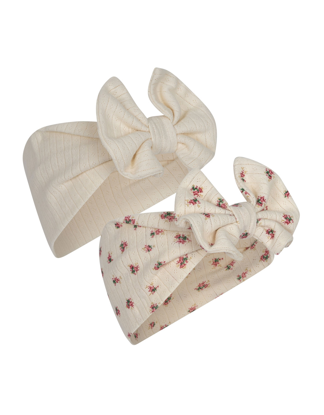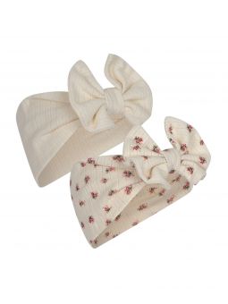 Bandeaux stretch en coton biologique imprimé Bloomie et uni écru, avec un gros noeud, pour agrémenter les looks de nos petites coquettes.