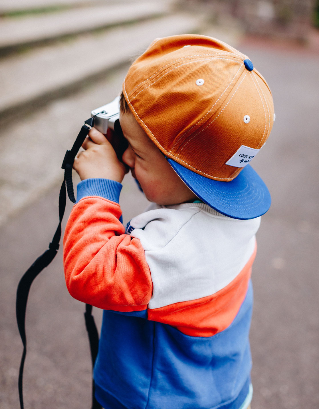 Casquette tendance en tissu caramel avec visière bleue vive et revers blanc pour enfant qui se mariera facilement avec toutes les couleurs des tenues de nos petits