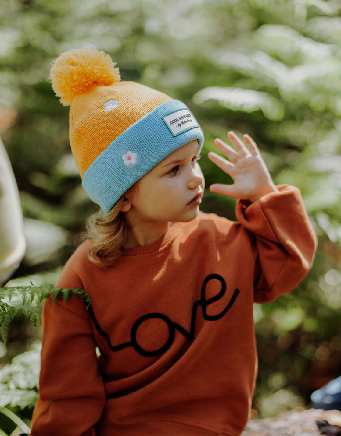 Un joli jeu de couleurs propre à Hello Hossy pour ce bonnet à pompon jaune brodé de marguerites.