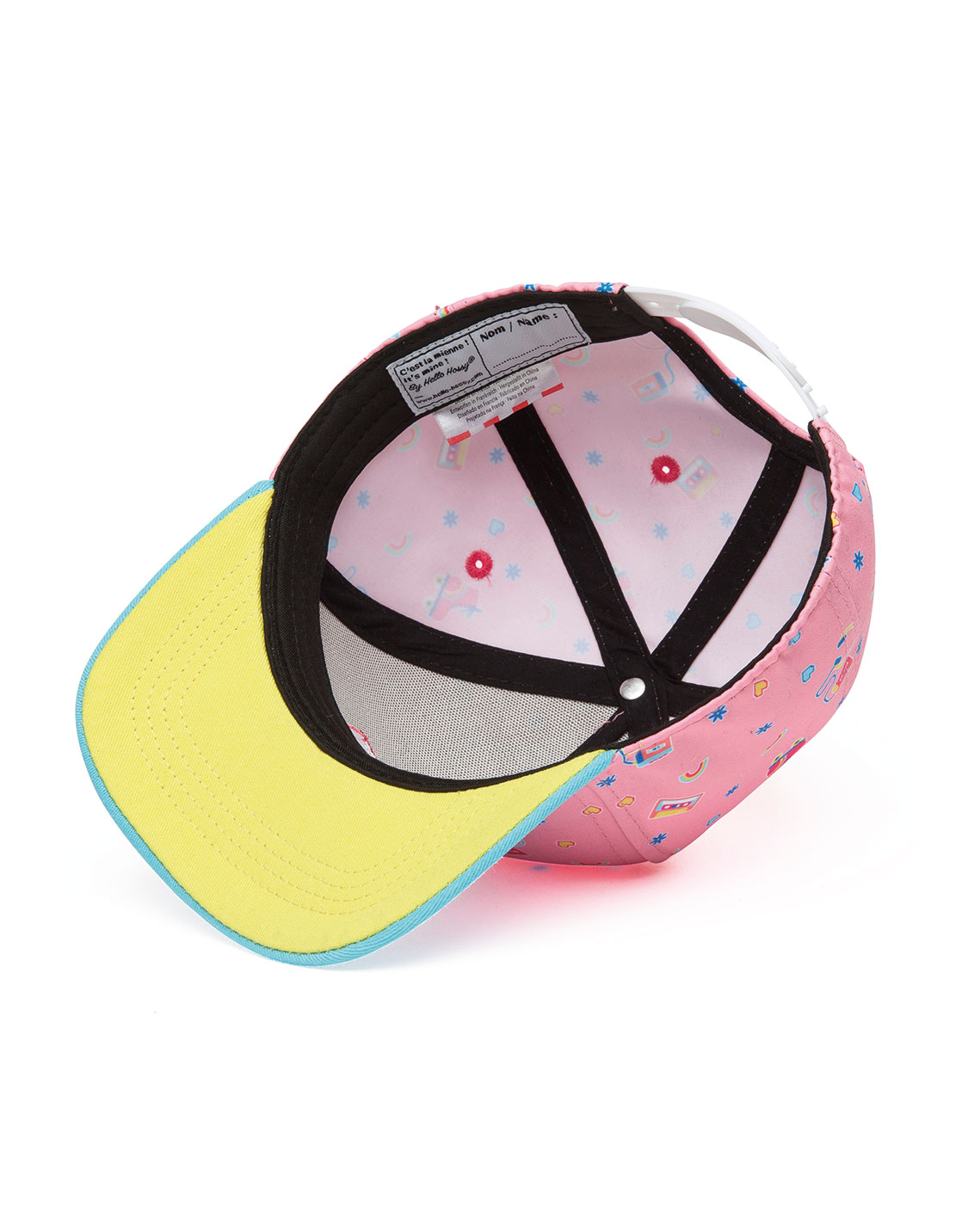 Une casquette pleine de peps! La casquette colorée Roller nous donne envie de nous évader sous le soleil avec ses motifs walkman, planche de skate, rollers, et arc en ciel.