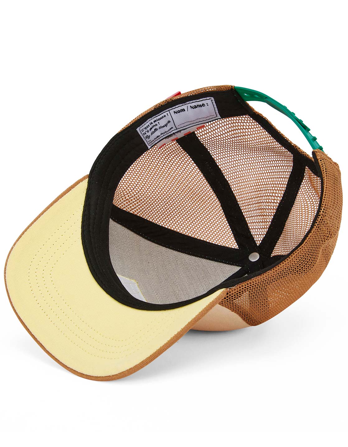 Une attache réglable verte à l'arrière permet de bien maintenir la casquette sur la tête des enfants.