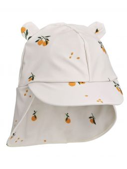 Le chapeau de soleil Senia aux jolis motifs de pêches, avec visière rembourrée et long cache cou protège parfaitement la tête de bébé.