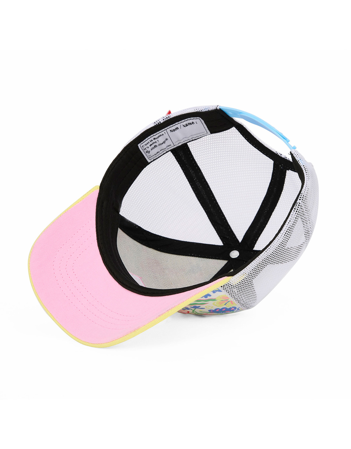 La casquette Garden Party fait partie des pièces fortes de la collection Truckers de Hello Hossy (les côtés et l'arrière sont en mailles). Avec ses motifs floraux multicolores, elle donne un look très frais! Elle est avec une visière courbée jaune et un revers rose.