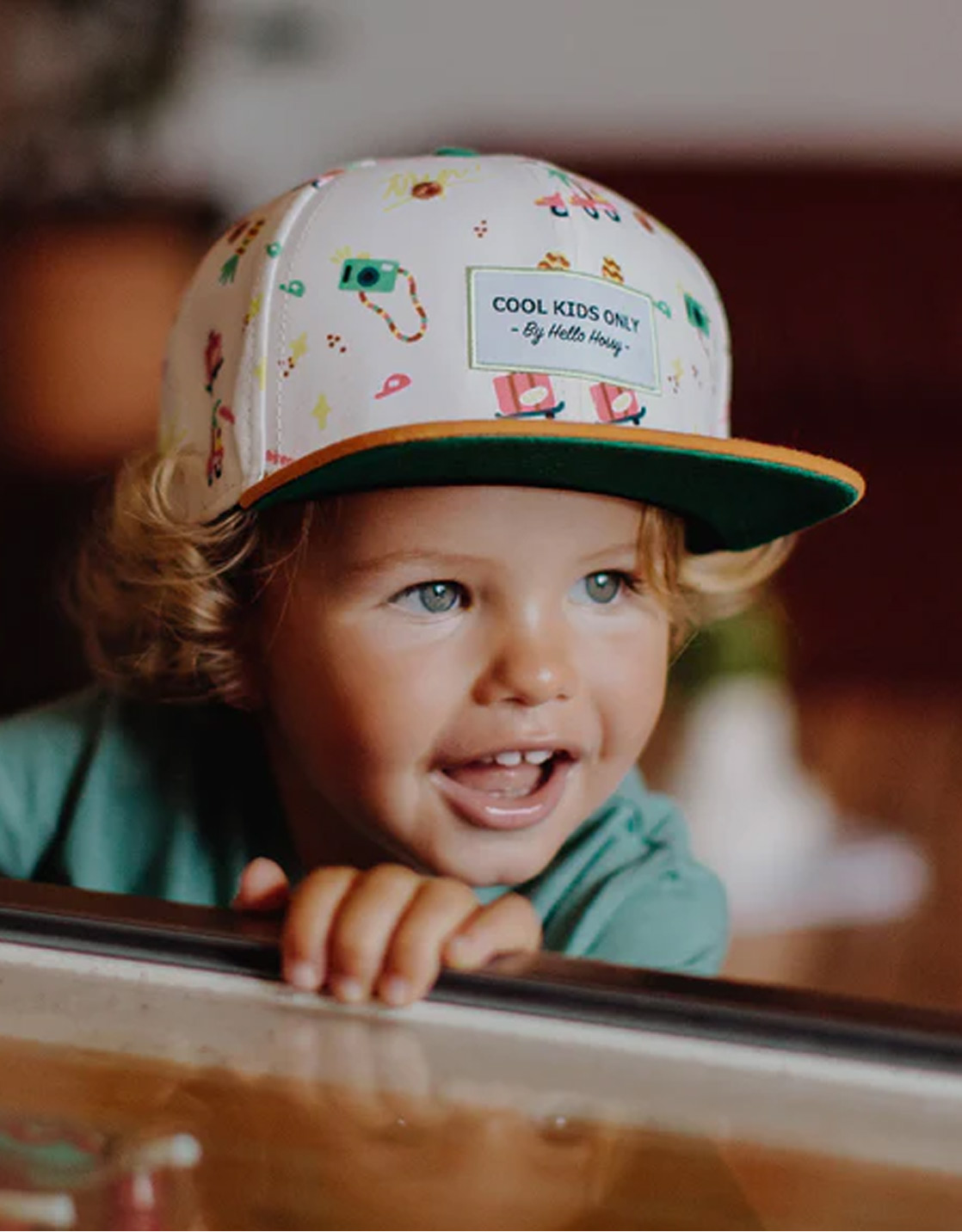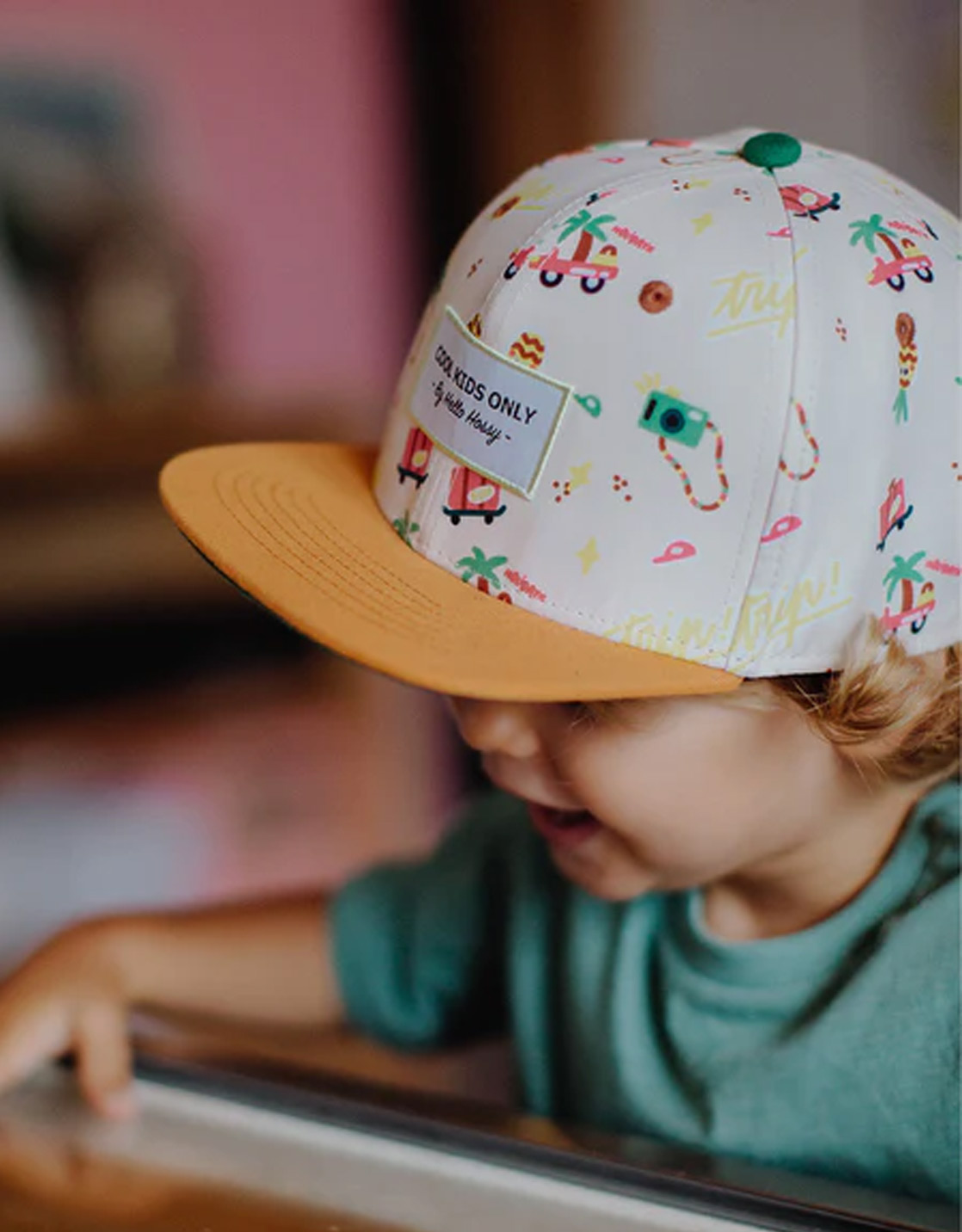 Modèle de la dernière collection écoresponsable Hello Hossy, la casquette Cool Trip avec sa visière plate se mariera facilement avec toutes les couleurs des tenues de nos petits.