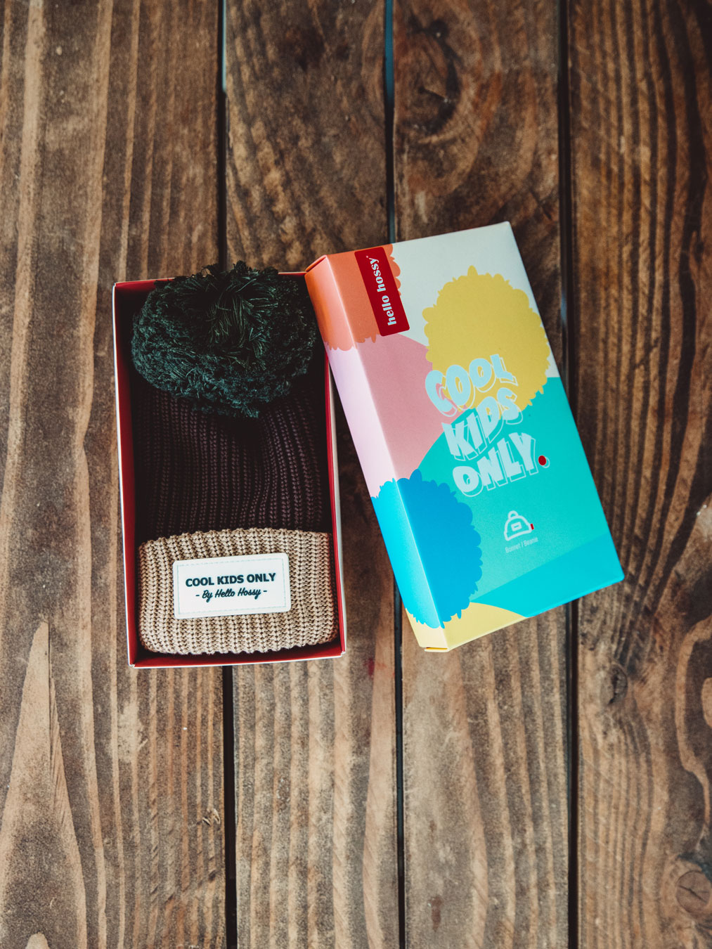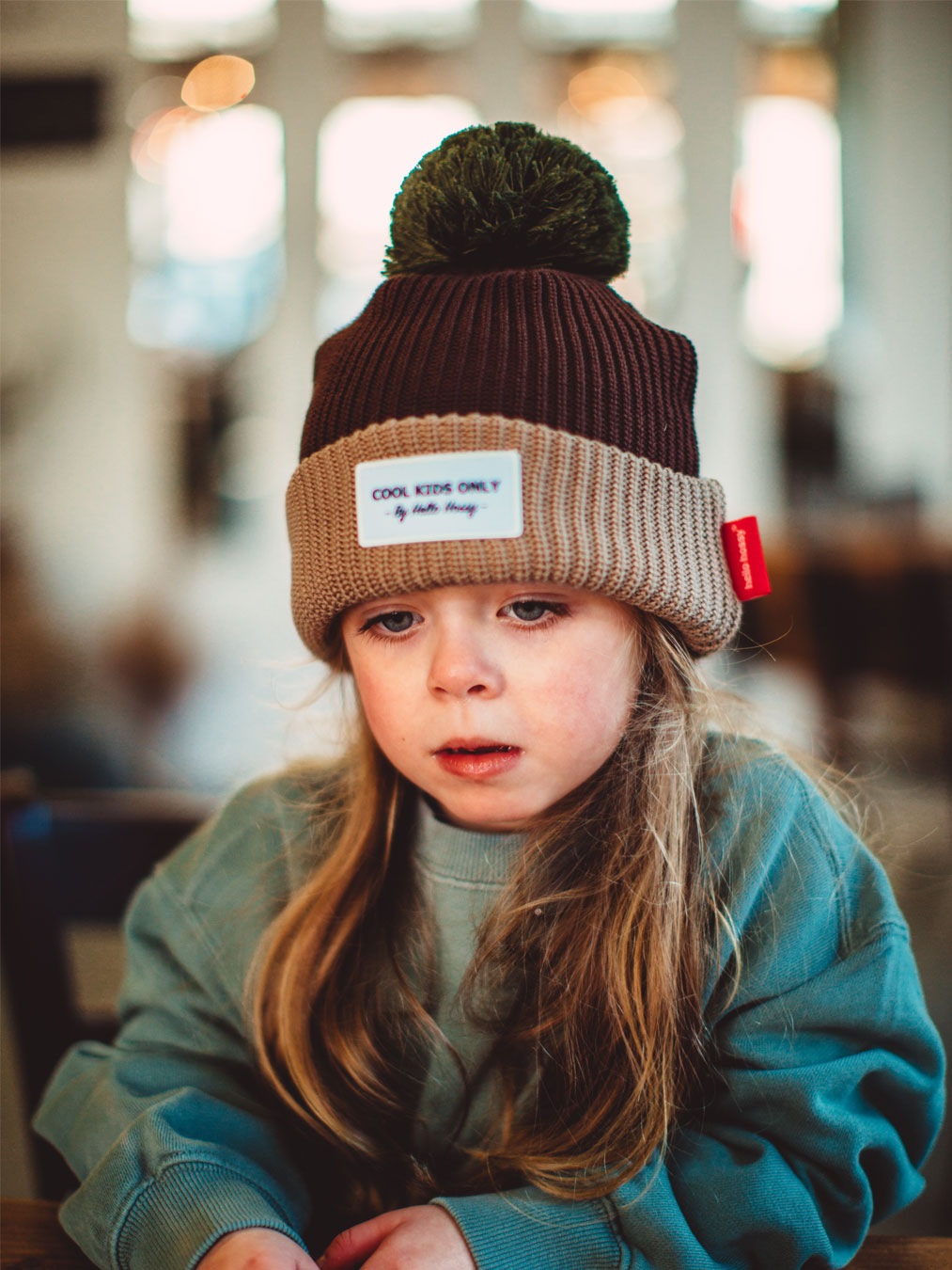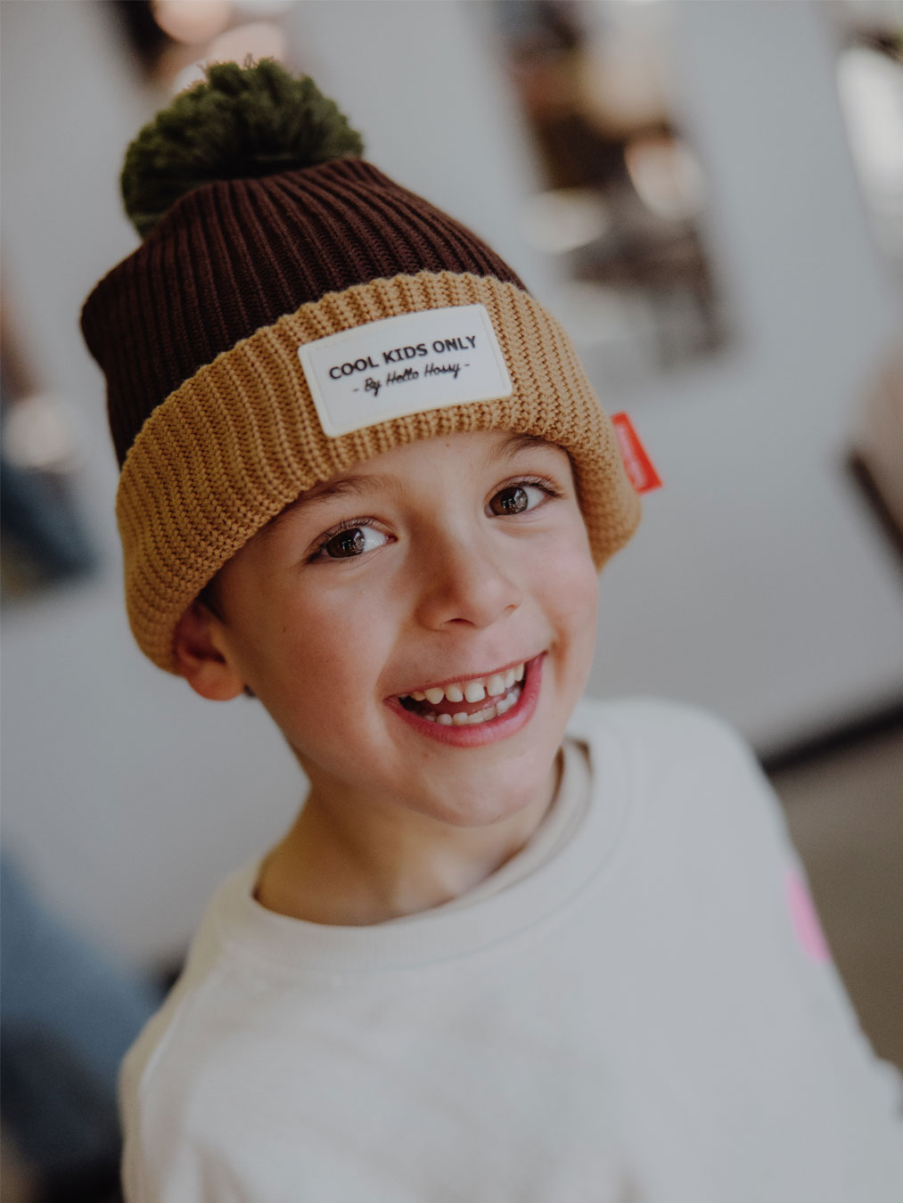 Bonnet brun au revers neige et avec un pompon vert en large maille chaude et confortable pour enfant, doublé de polaire, et au design soigné propre à la marque française Hello Hossy qui se mariera facilement avec toutes les couleurs des tenues de nos petits.