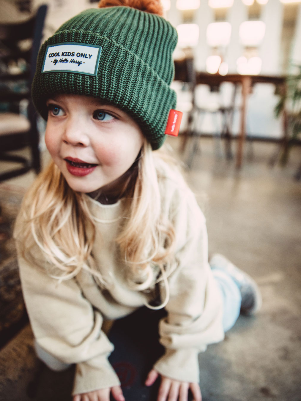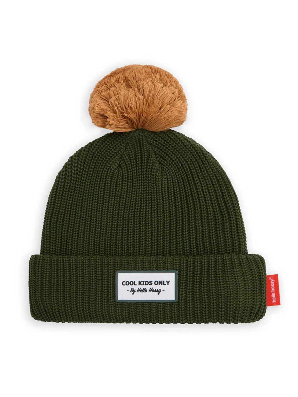 Bonnet vert sapin avec un pompon marron en large maille chaude et confortable pour enfant, doublé de polaire, et au design soigné propre à la marque française Hello Hossy qui se mariera facilement avec toutes les couleurs des tenues de nos petits.