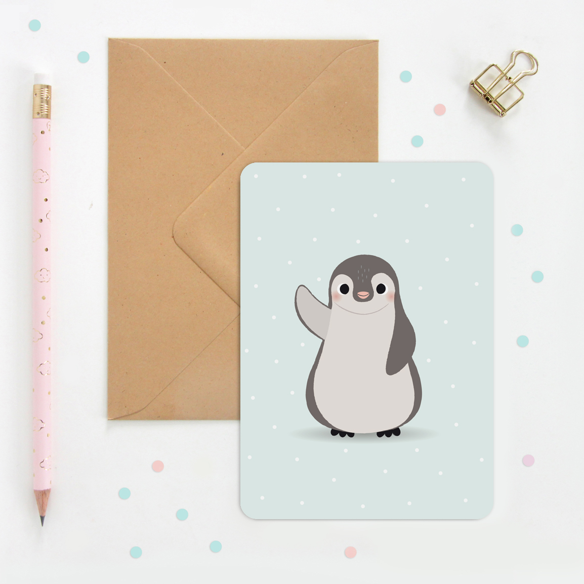 Une carte remplie de tendresse, le manchot nous saluant est une illustration unique de la créatrice Zü. Une jolie carte pour accompagner vos cadeaux de naissance, anniversaires, et autres occasions heureuses.
