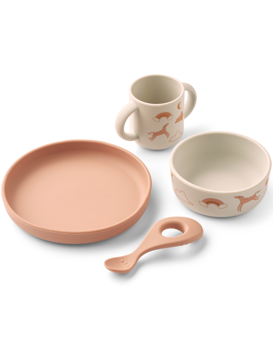 Une chouette idée cadeau ce coffret repas sur le thème du rêve (arc en ciel, lune et cheval,..) composé d'un bol, d'une assiette, d'un gobelet et d'une cuillère.