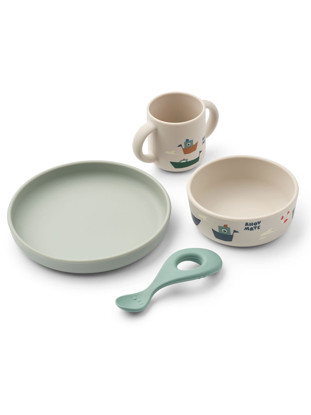 Une chouette idée cadeau ce coffret repas sur le thème des bateaux. Set composé d'un bol, d'une assiette, d'un gobelet et d'une cuillère.