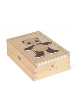 Dans cette jolie boîte en bois se cachent 4 tenues d'animaux à mixer ou à associer entre eux et 4 visages pour déguiser le petit ourson. Le couvercle de la boîte est le support pour assembler les pièces du puzzle.
