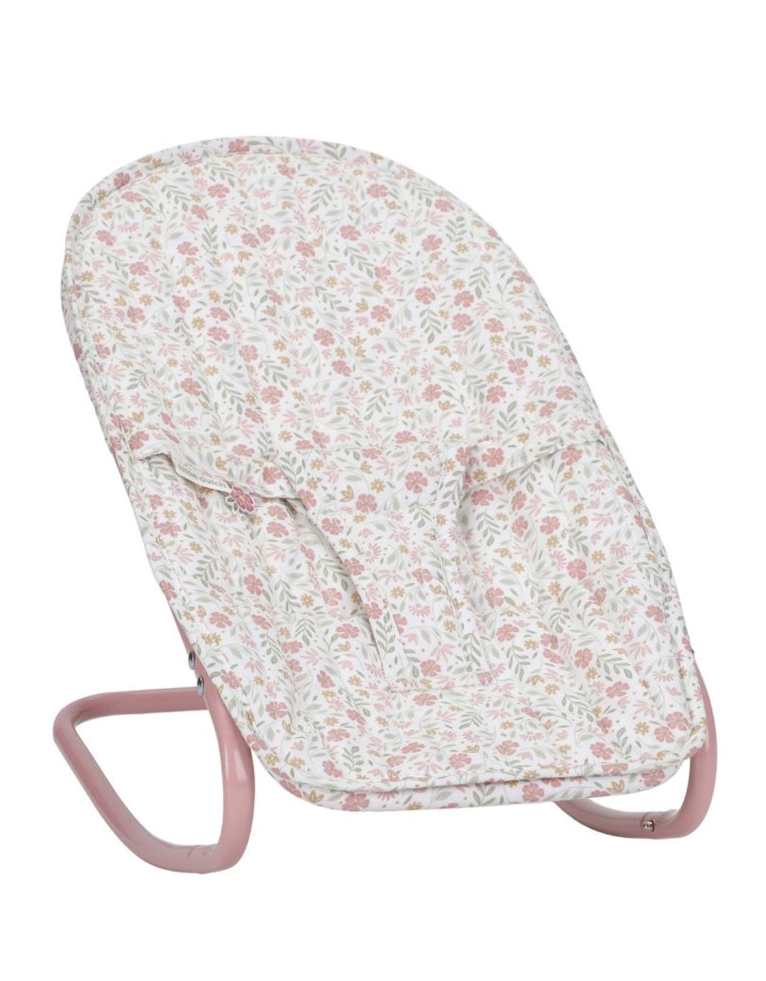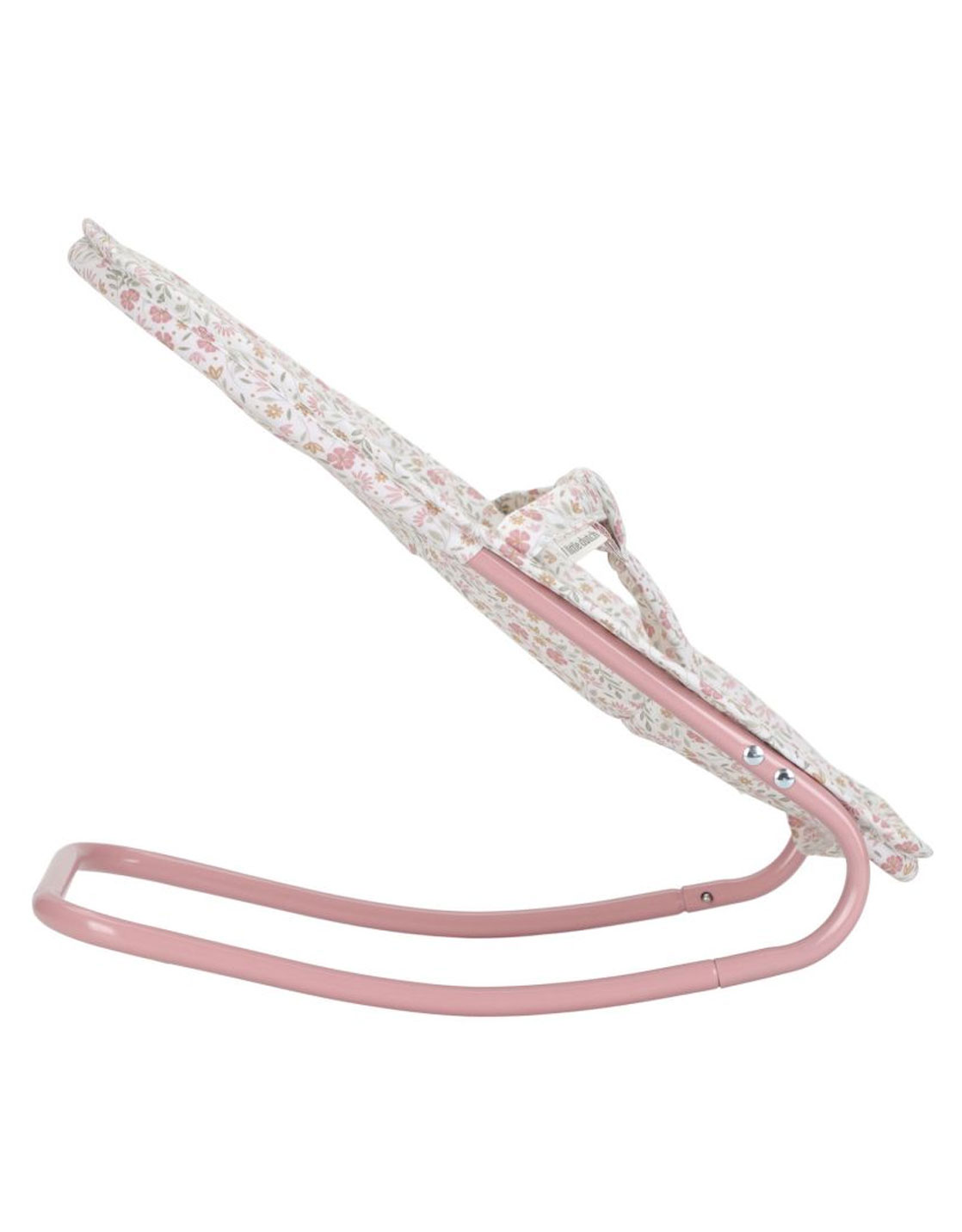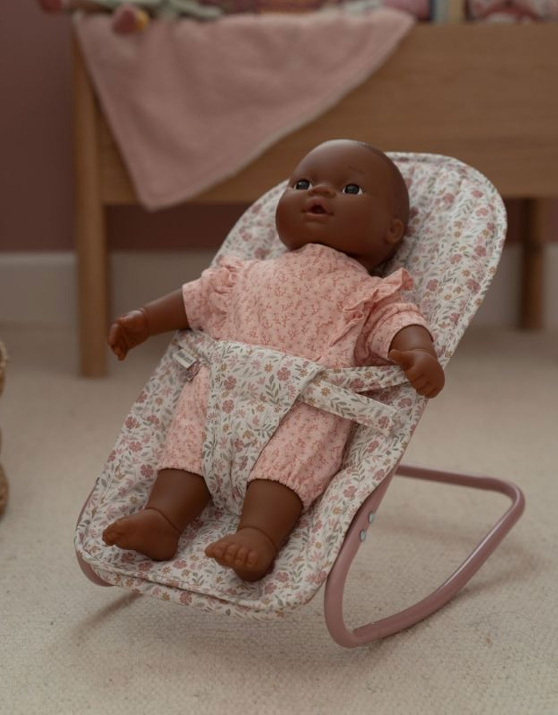 Transat pour poupée en coton imprimé de fleurs sur un châssis métal vieux rose. La sangle est ajustable pour bien serrer la poupée et imiter les adultes. Le transat servira aux enfants aussi bien pour nourrir leurs poupées que pour les bercer : un jeu d'imitation utile et peu encombrant!