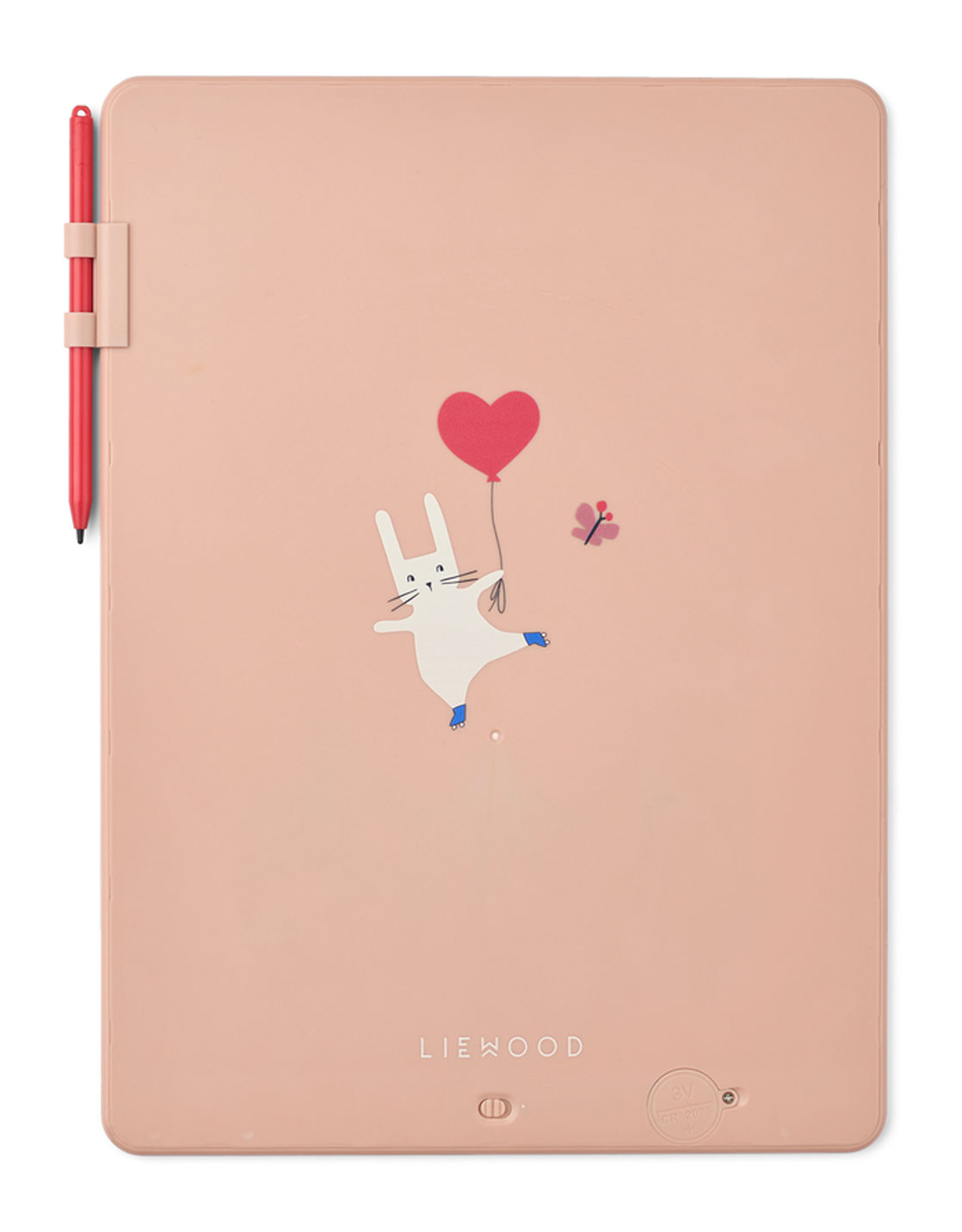 Laissez libre cours à la créativité de nos enfants avec cette grande tablette de dessin magique Zora de chez Liewood, décorée d'un lapin.