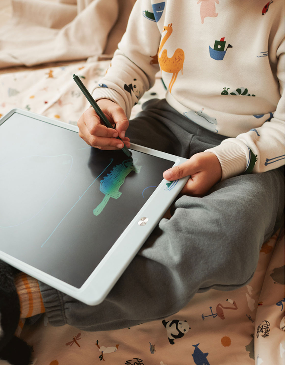Géniale cette maxi tablette de dessin magique Zora avec un lapin célébrant avec amour les 10 ans de Liewood. On l'emmène partout et nos enfants dessinent à l'infini.