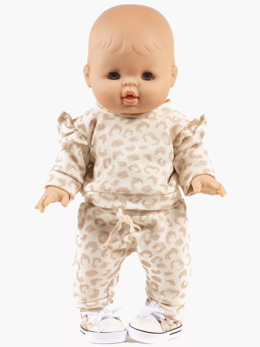 Jogging Tanga en coton collection Féline à manches longues avec un bouton pression au dos pour poupée. On aime les petits volants aux épaules et le faux cordon noué au pantalon.