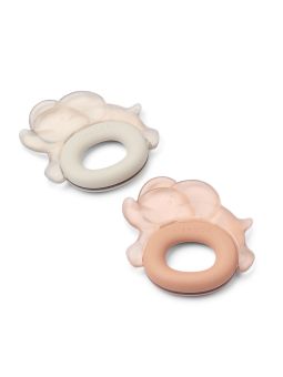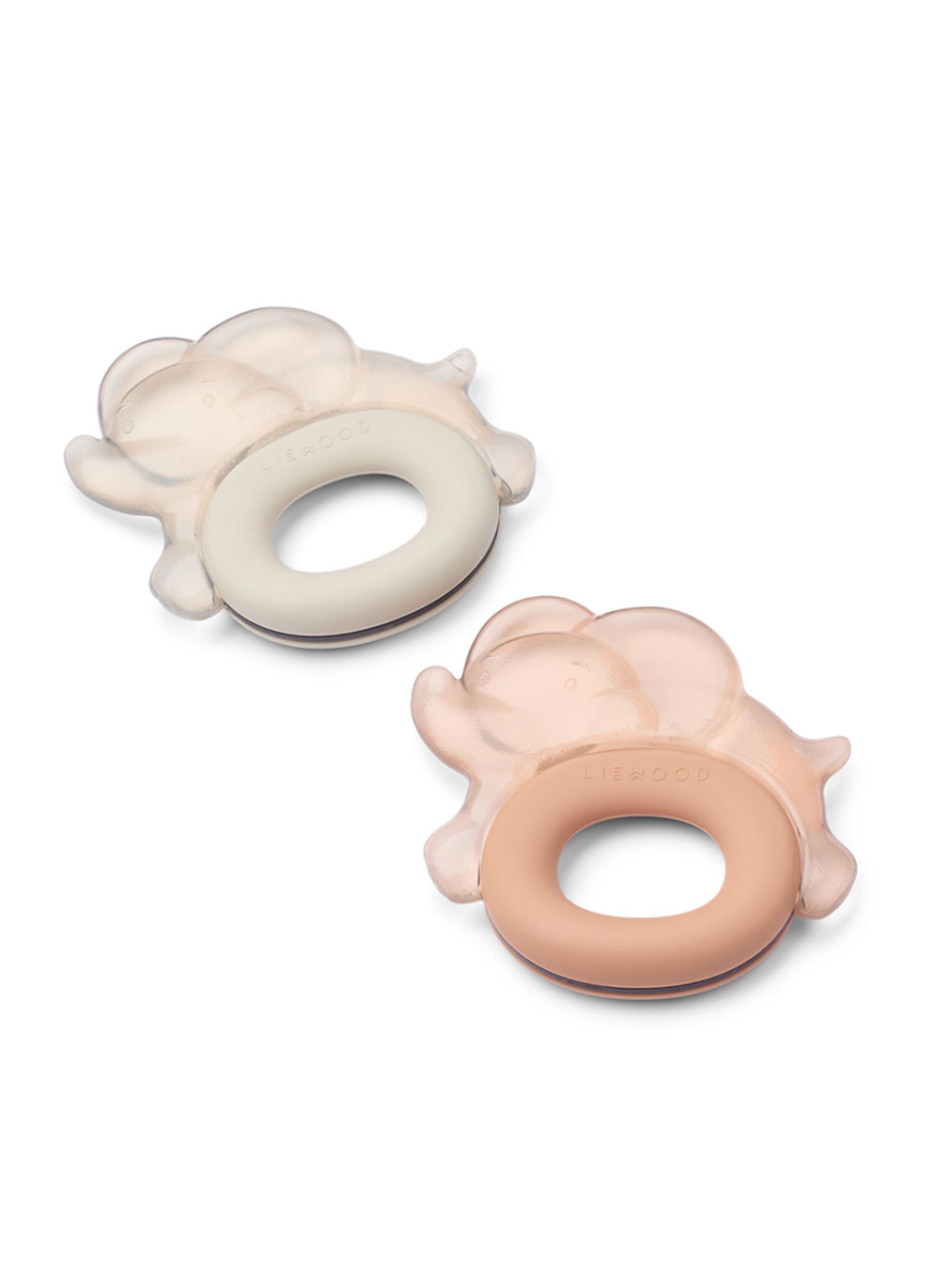 Lot de 2 jouets de dentition éléphant Rita couleur Rose et sable, à mâchouiller. L'anneau en silicone est facile à tenir en main. L'éléphant est composé en EVA souple de qualité alimentaire et le liquide contenu à l'intérieur, à réfrigérer, est de l'eau distillée.