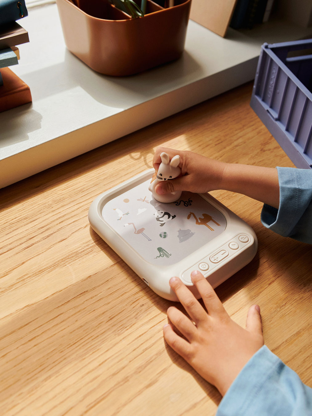 Tableau d'activités interactif Archie avec un petit lapin en silicone à positionner sur les animaux ou objets pour émettre et écouter les sons correspondants.