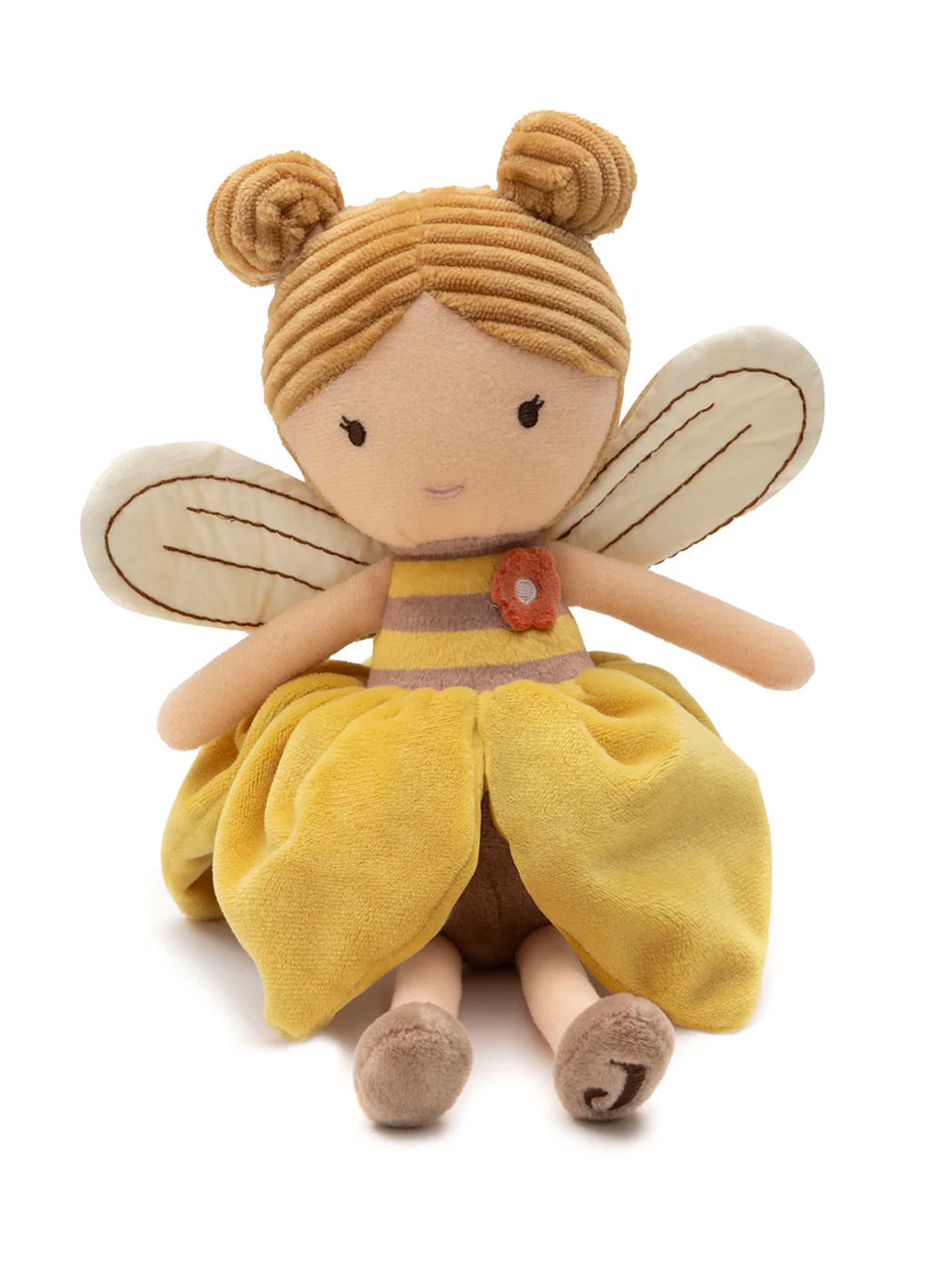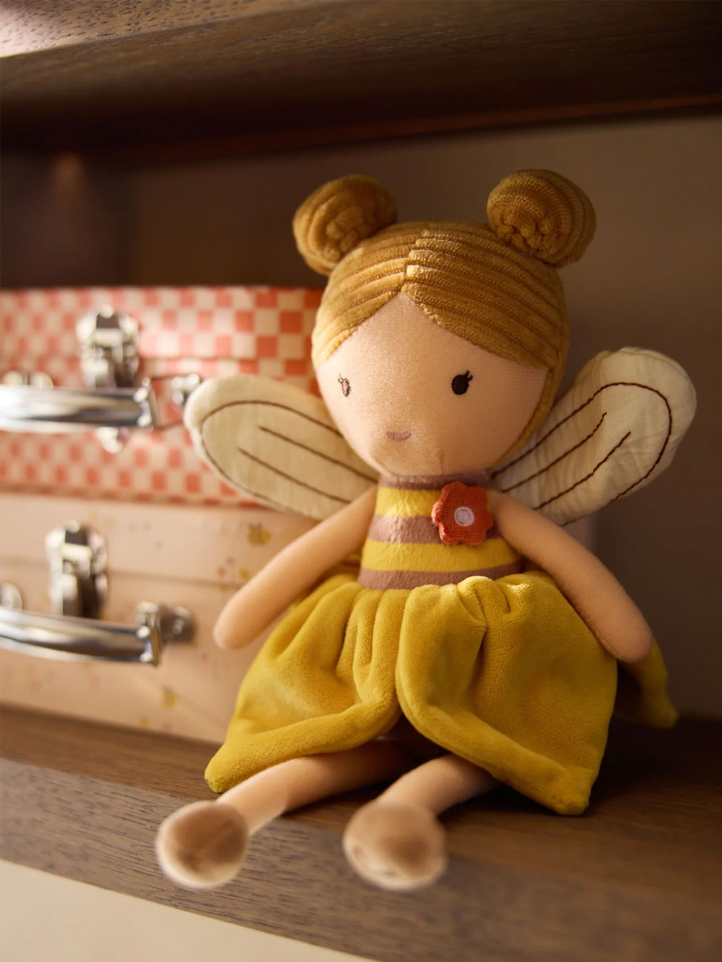 Adorable poupée en tissu Lily. Avec ses ailes et sa tenue d'abeille elle sera adoptée rapidement par bébé, que ce soit en doudou ou peluche.