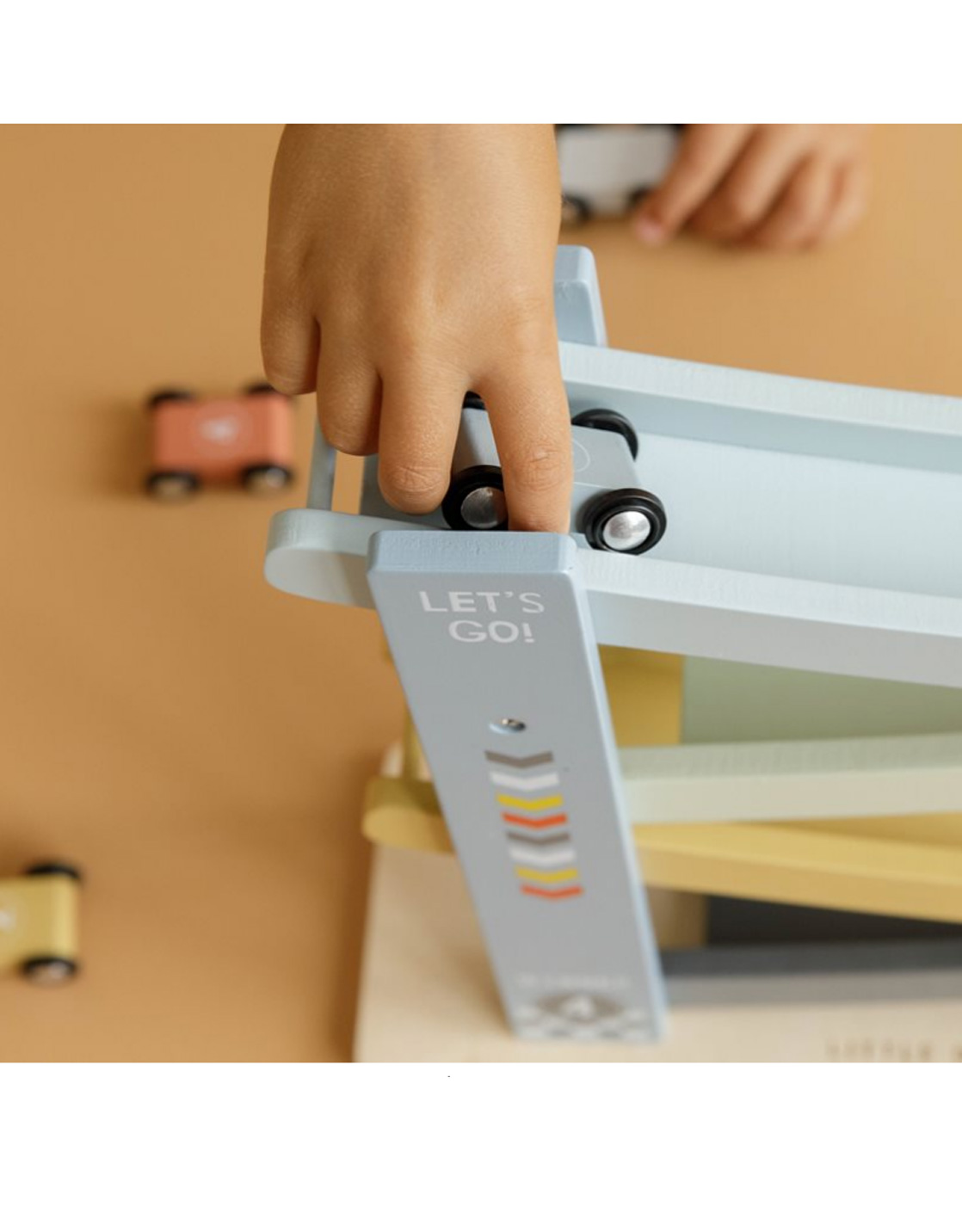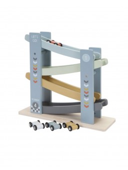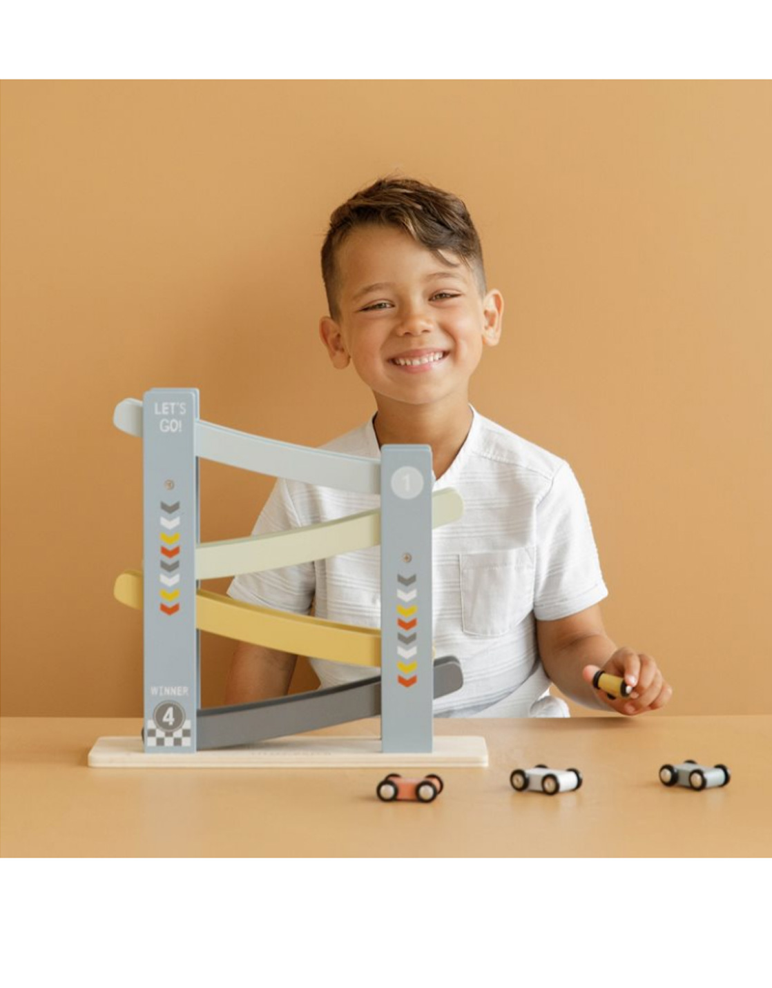 Votre enfant s'amusera à suivre des yeux ces petites voitures de course en bois dévaler les pentes de son circuit
