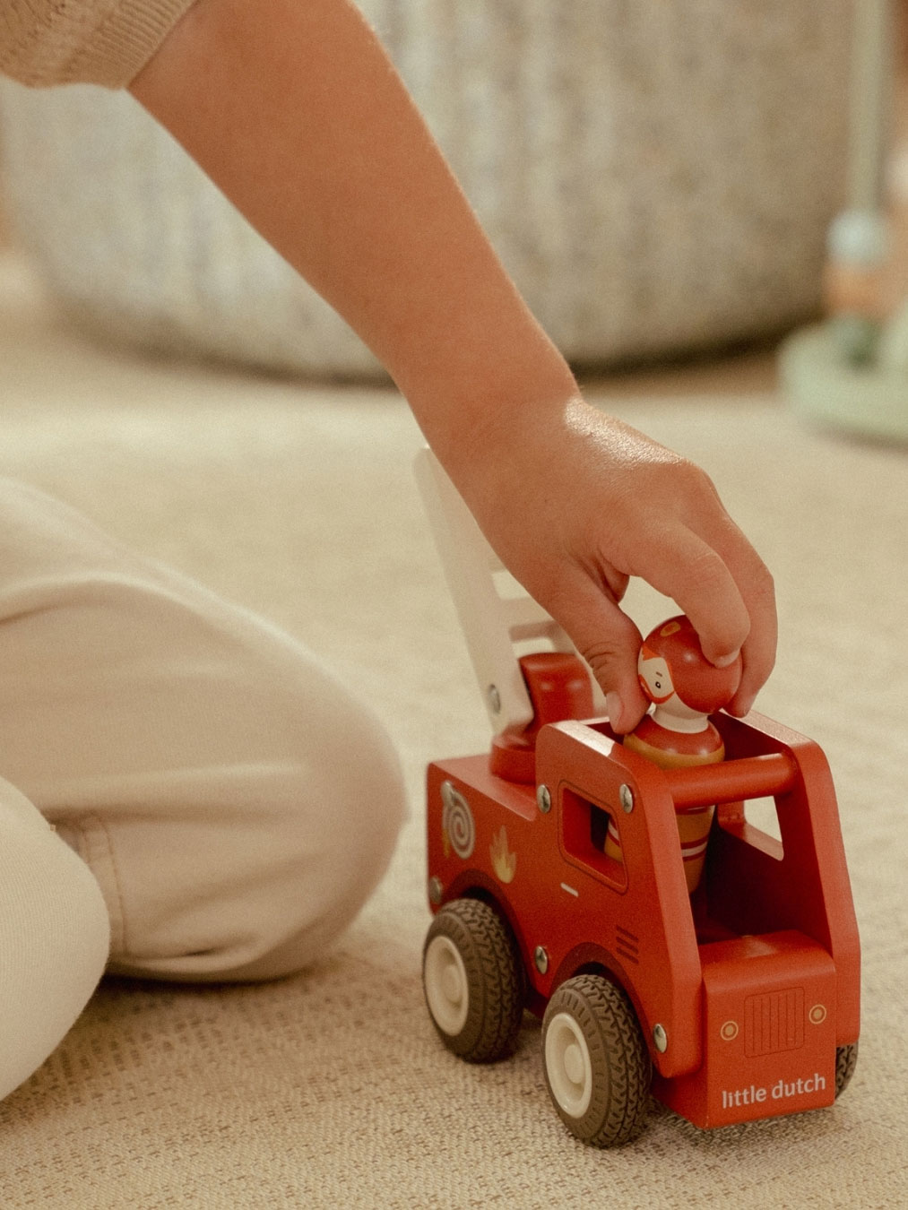 Le camion de pompiers est facile à saisir par les jeunes enfants grâce à sa forme géométrique. L'enfant pourra déployer la grande échelle zt y faire grimper notre super pompier.