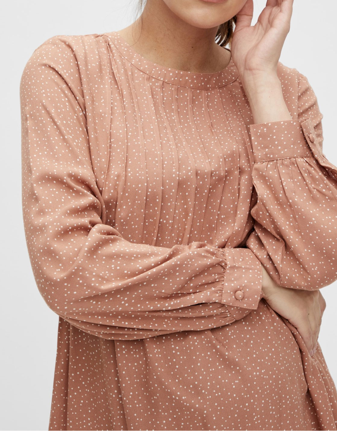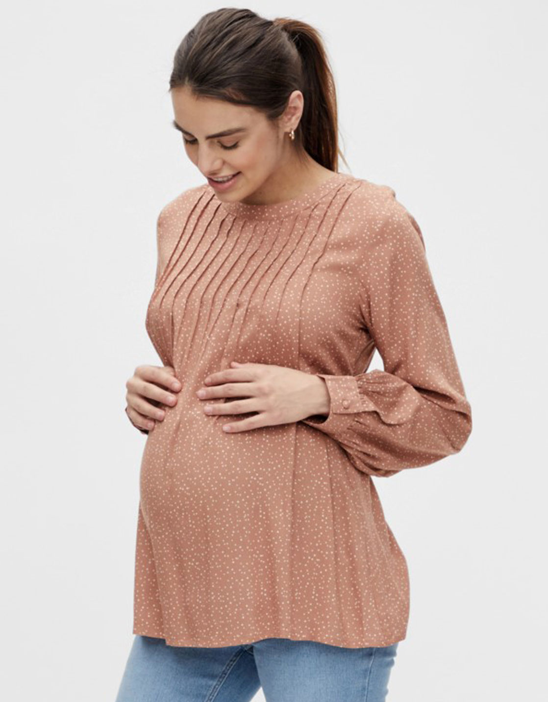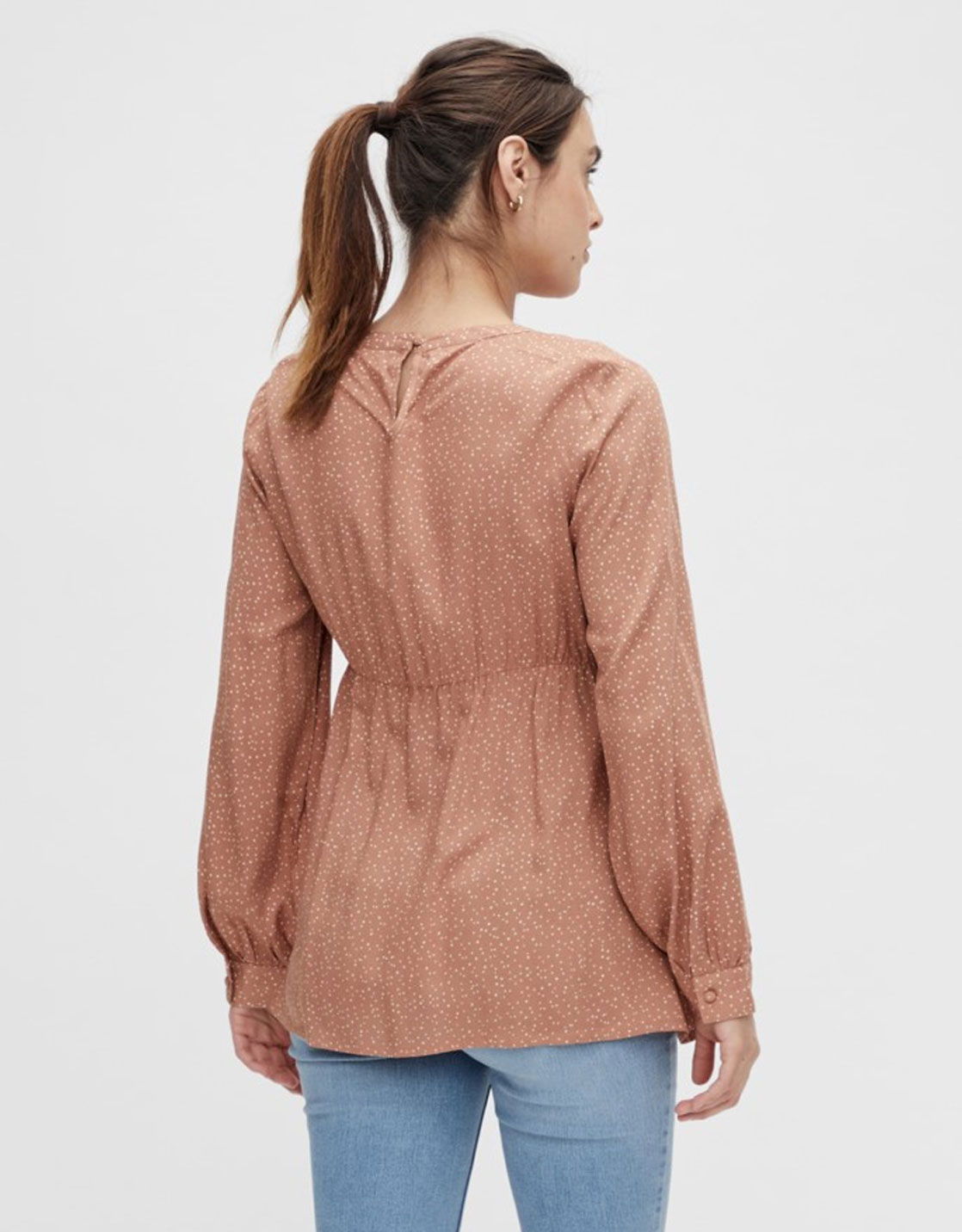 Un élégant haut pour future maman, terra cotta à pois blancs. Un joli jeu plissé sur la poitrine offre une coupe naturellement cintrée, à ajuster avec la ceinture amovible ton sur ton.