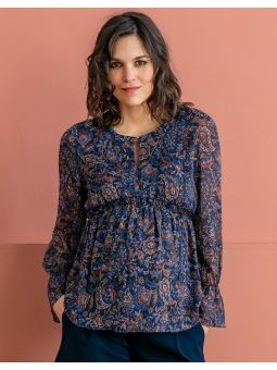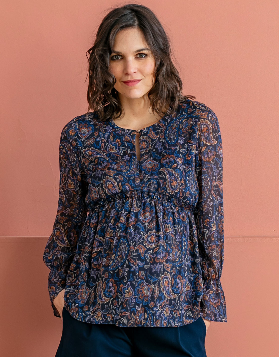 Blouse chic pour future maman en crépon dans un superbe imprimé, tissé de lurex doré pour apporter une touche lumineuse et automnale.