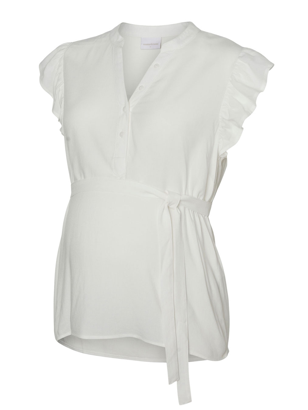 Chic et féminin , le petit chemisier blanc à manches courtes volantées va absolument avec tout : jupe, jean, sous une salopette, c'est un indispensable dans le dressing des futures mamans.