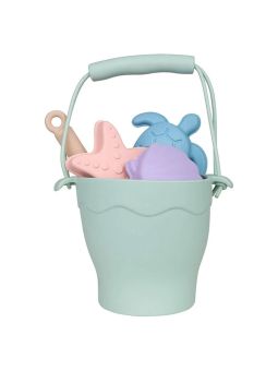 Jouet en silicone flexible sans risque et résistante, prévue pour une utilisation par de jeunes enfants. Le kit comprend un seau souple avec anse, une pelle, et trois moules de plage en forme d'animaux (tortue, étoile de mer, coquillage).