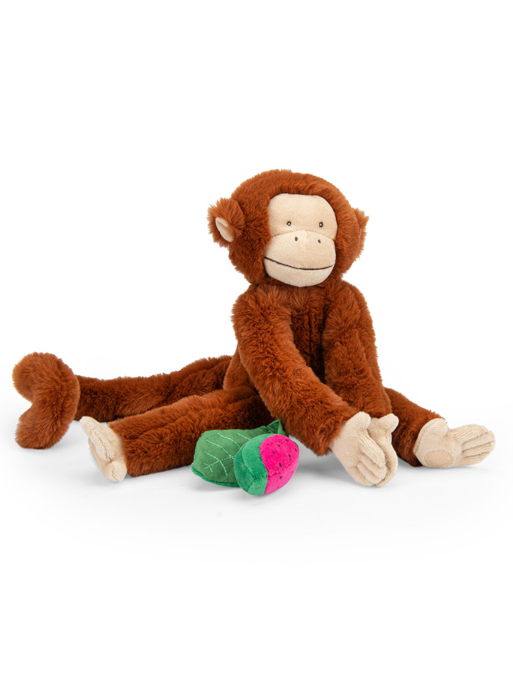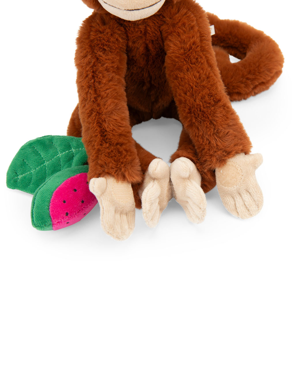 Mochica est une peluche d'une douceur incroyable, et le grelot dans le singe et la pastèque vont développer la curiosité de bébé ainsi que sa motricité.