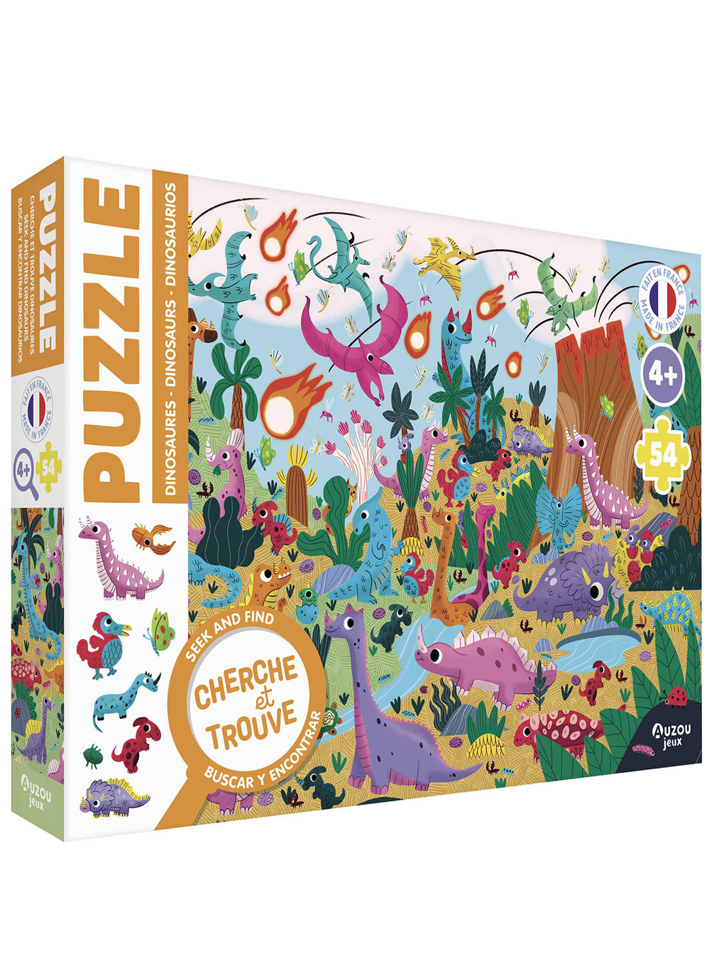 Un Cherche et Trouve version puzzle de 54 pièces pour les enfants, sur le thème des dinosaures.