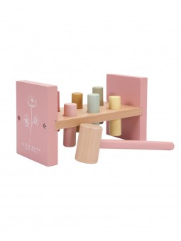 Un jouet pour les futures bricoleuses, en bois et teintes roses avec un marteau en bois et 6 tiges à enfoncer. Jouet réversible.