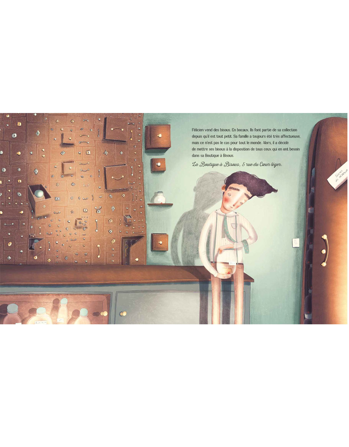 Félicien tient la boutique à bisous, rue du coeur léger, et y vend toutes sortes de bisous pour ceux qui en ont besoin. Précieusement enfermés dans des bocaux...