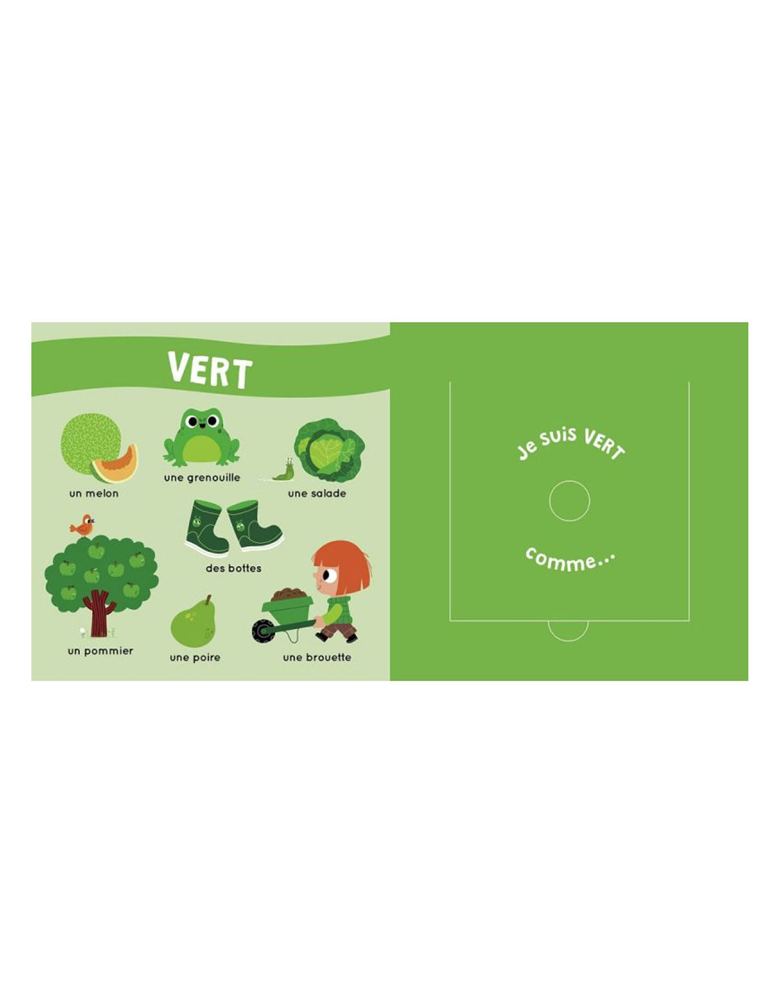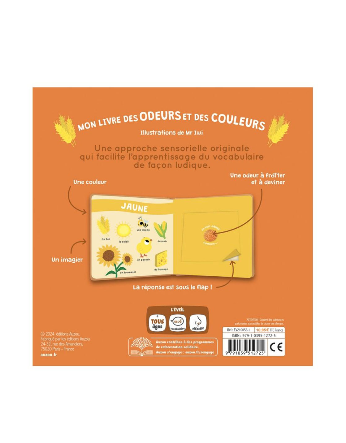 En frottant son doigt, l'enfant y découvrira l'odeur d'un fruit, légume, fleur, ou autre objet de la couleur de la page.