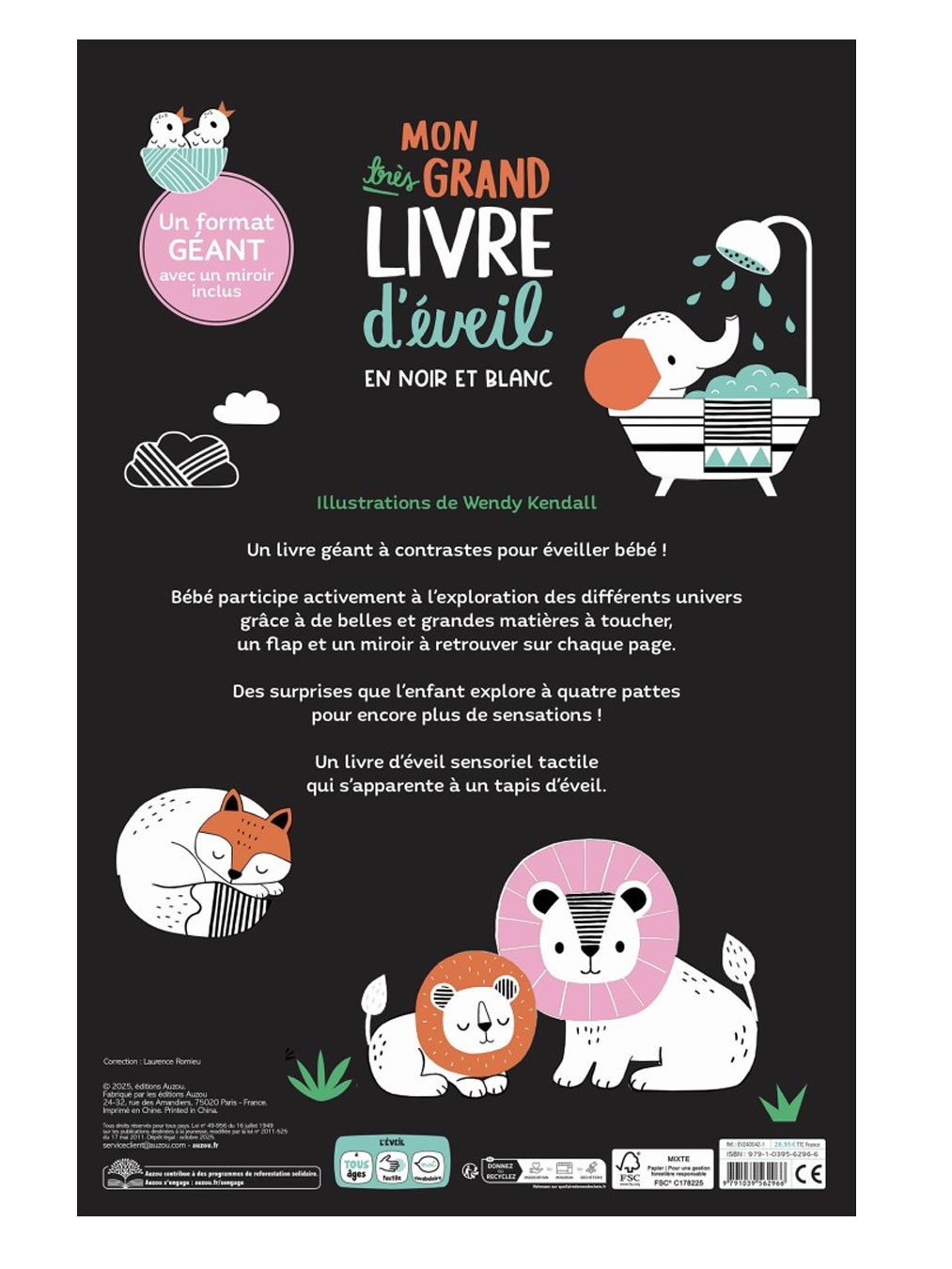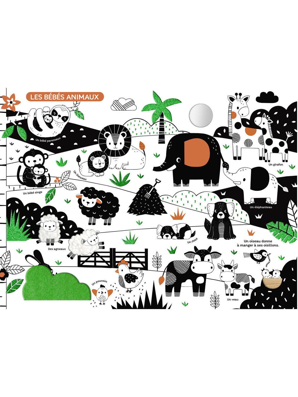 Découvrez avec bébé les 4 très grandes planches de ce méga livre d'éveil à contrastes avec 20 matières à toucher et un miroir.