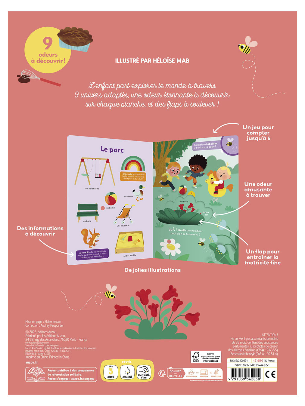 Avec ce grand livre cartonné des odeurs, les jeunes enfants vont stimuler leur odorat en découvrant une odeur derrière chaque flap à soulever, mais apprendront également à compter avec un jeu à chaque double page.