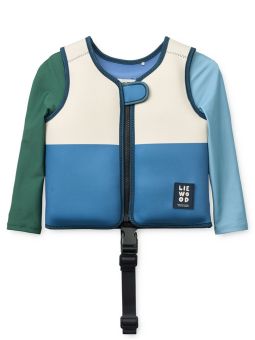 Gilet de natation en néoprène avec des manches longues, offrant une vraie liberté de mouvement à nos petits nageurs : parfait pour prendre confiance dans l'eau. Le gilet Riverside a un joli design avec ses blocs de couleurs bleu et vert.