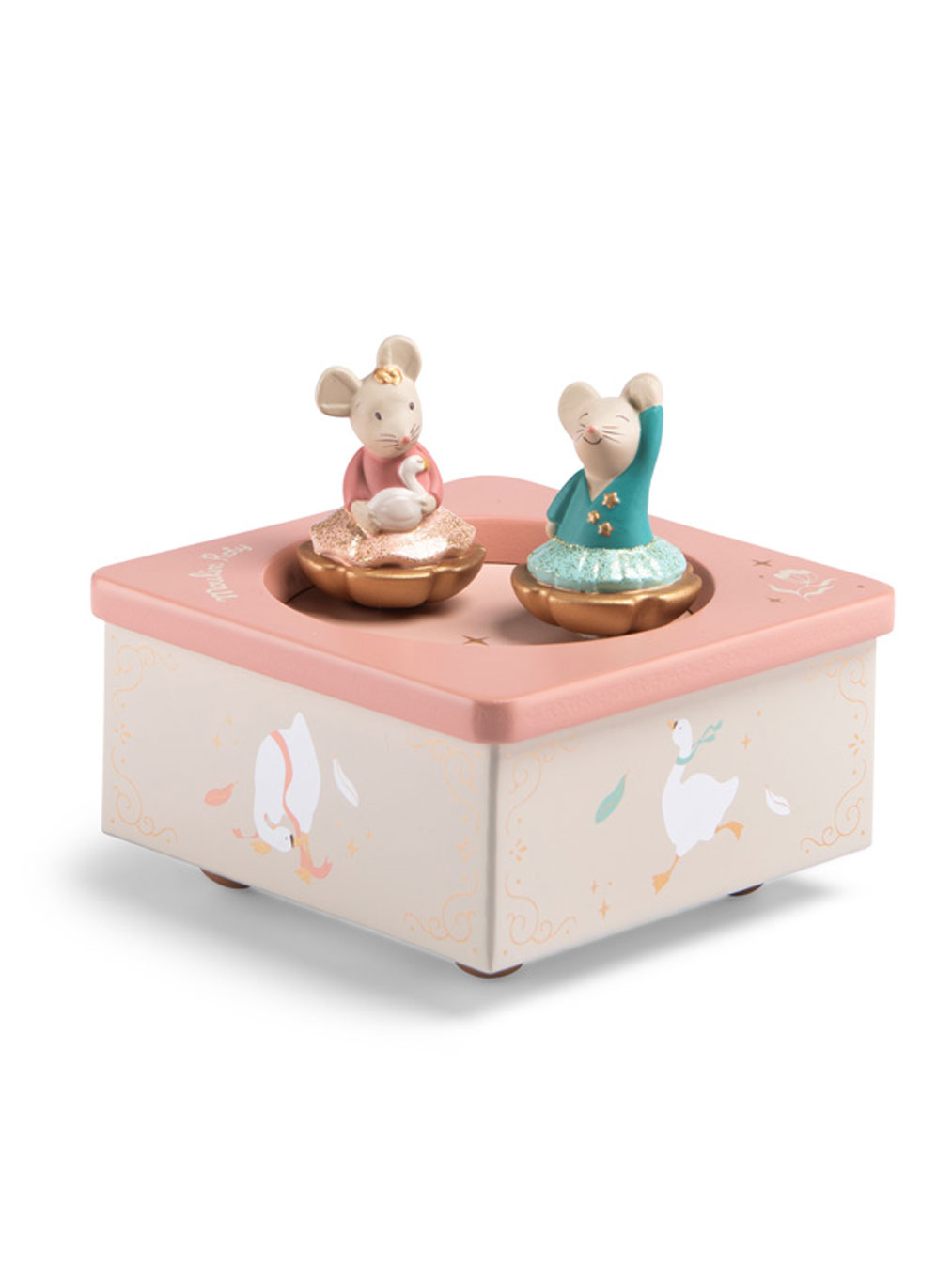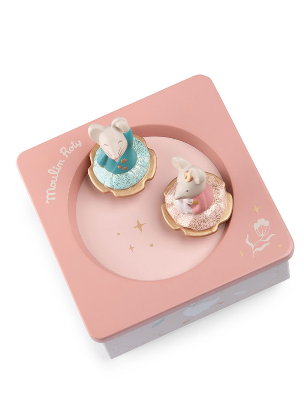 La boîte à musique La petite école de danse est décorée aux couleurs de la collection, tournez délicatement en dessous pour lancer la danse magique. Lorsque la mélodie commence à résonner, les deux souris dansent avec grâce sur les notes de musique.