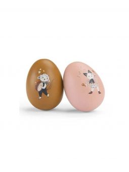 Oeufs Maracas en bois peint rose et taupe décorées des illustrations de la collection "Après la pluie"