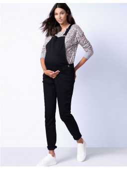 Salopette noire en jean de de grossesse avec bretelles réglables et boutons ajustables aux hanches. Plus le ventre s'arrondit, et on plus on relâche les bretelles afin d'adapter la salopette à votre nouvelle silhouette. En jean super stretch, elle est agréable à porter été comme hiver, avec un pull ou un tee shirt.