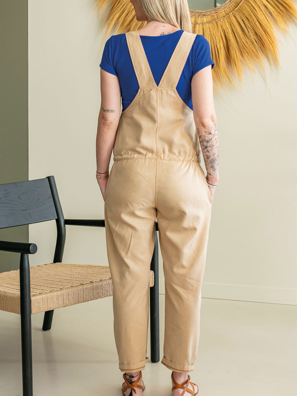 Salopette de grossesse Phoebe safari, en lin et coton avec bretelles réglables et fermetures zip ajustables aux hanches.