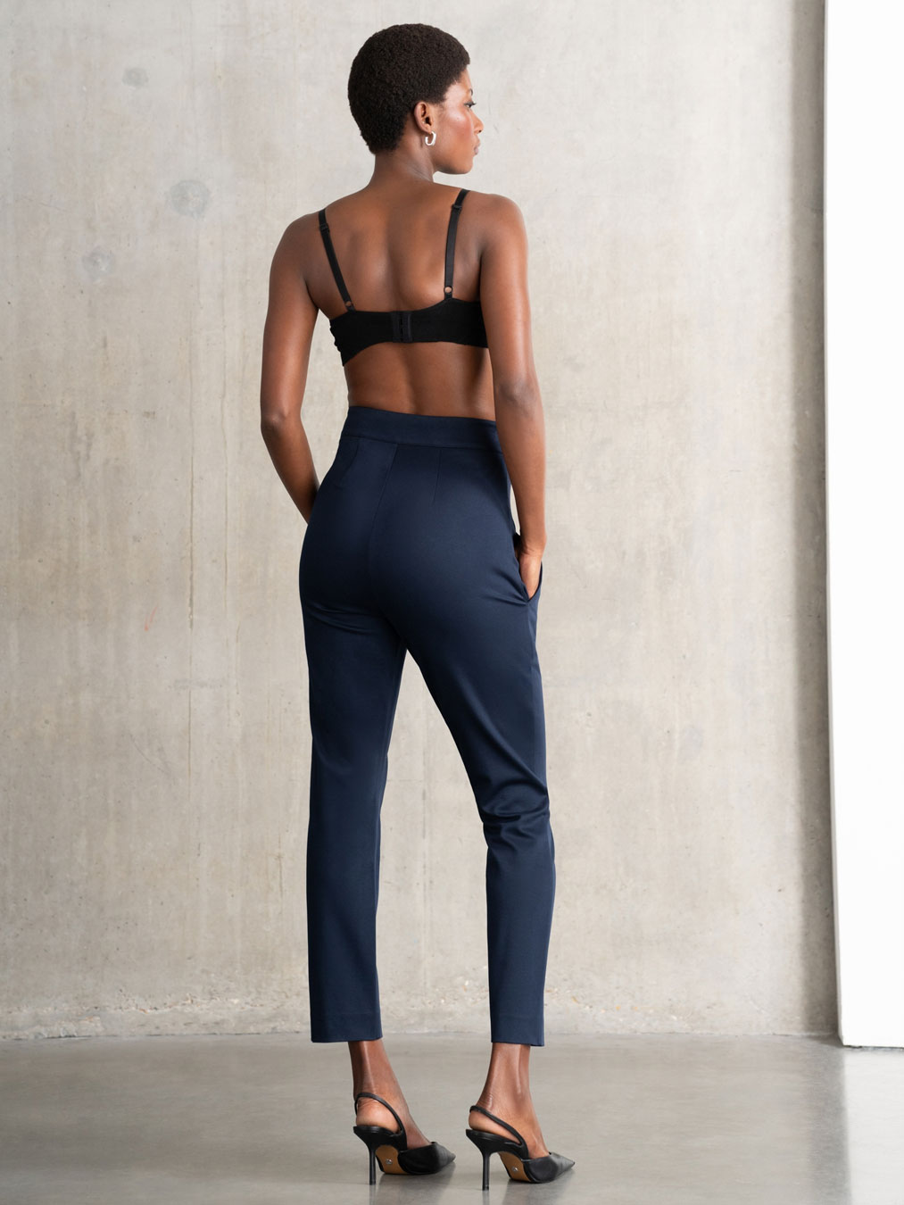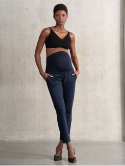 Pantalon élégant bleu foncé pour femme enceinte. Coupe fuselée avec une taille élastique, il s'adapte à la morphologie de la future maman au fil des neuf mois.