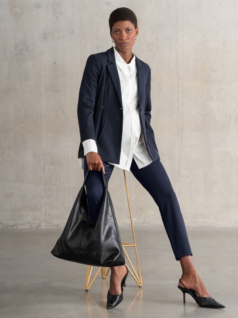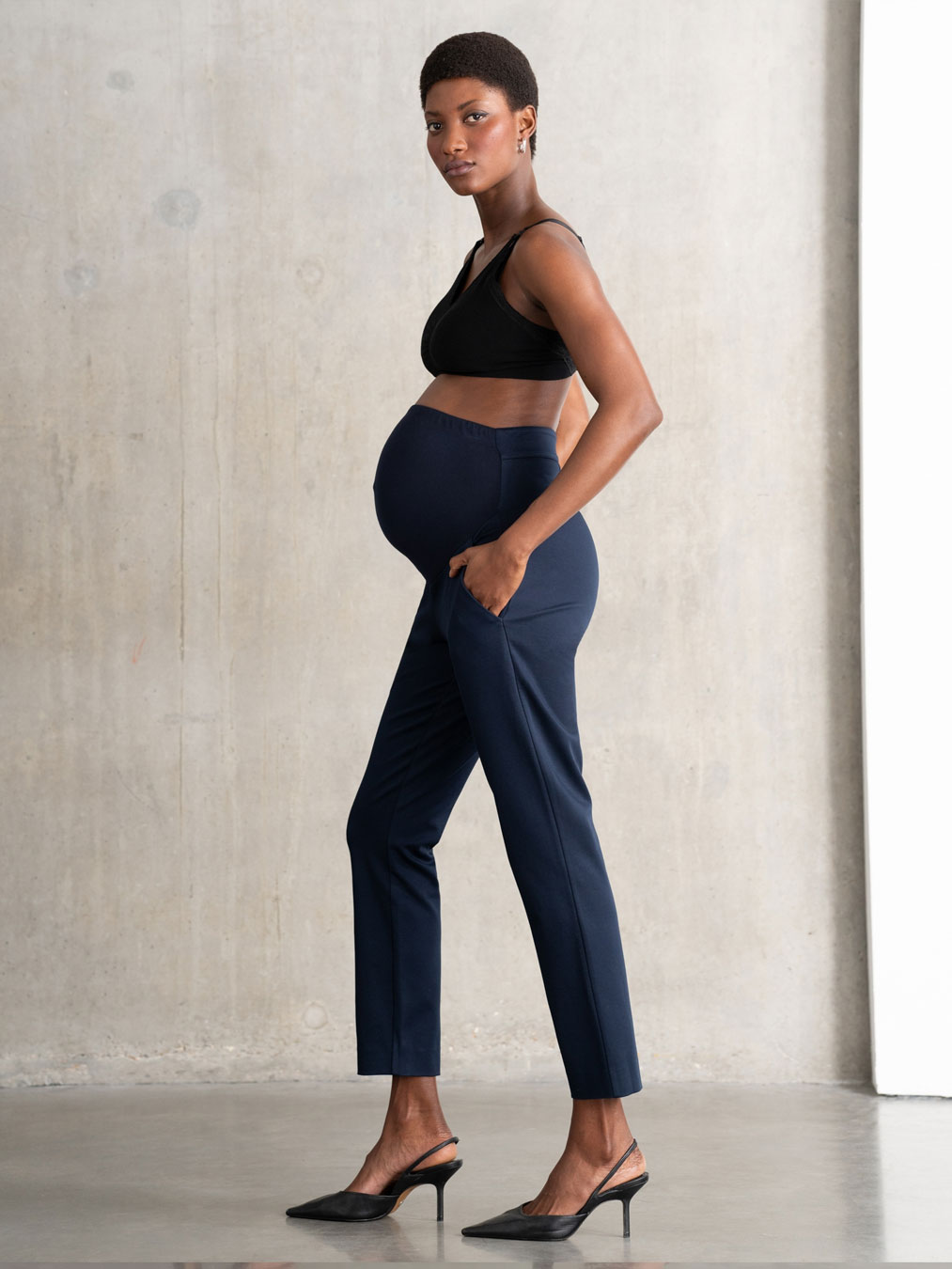 Avec un bandeau de grossesse intégré pour un confort optimal, ce pantalon ajusté bleu foncé coupe fuselée est irrésistiblement doux et confortable.
