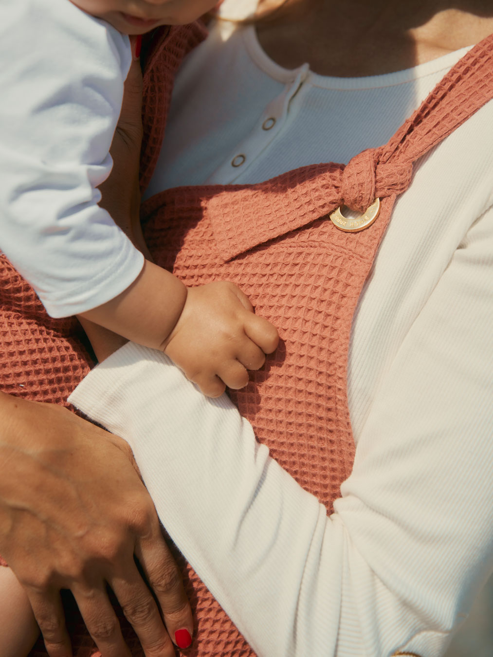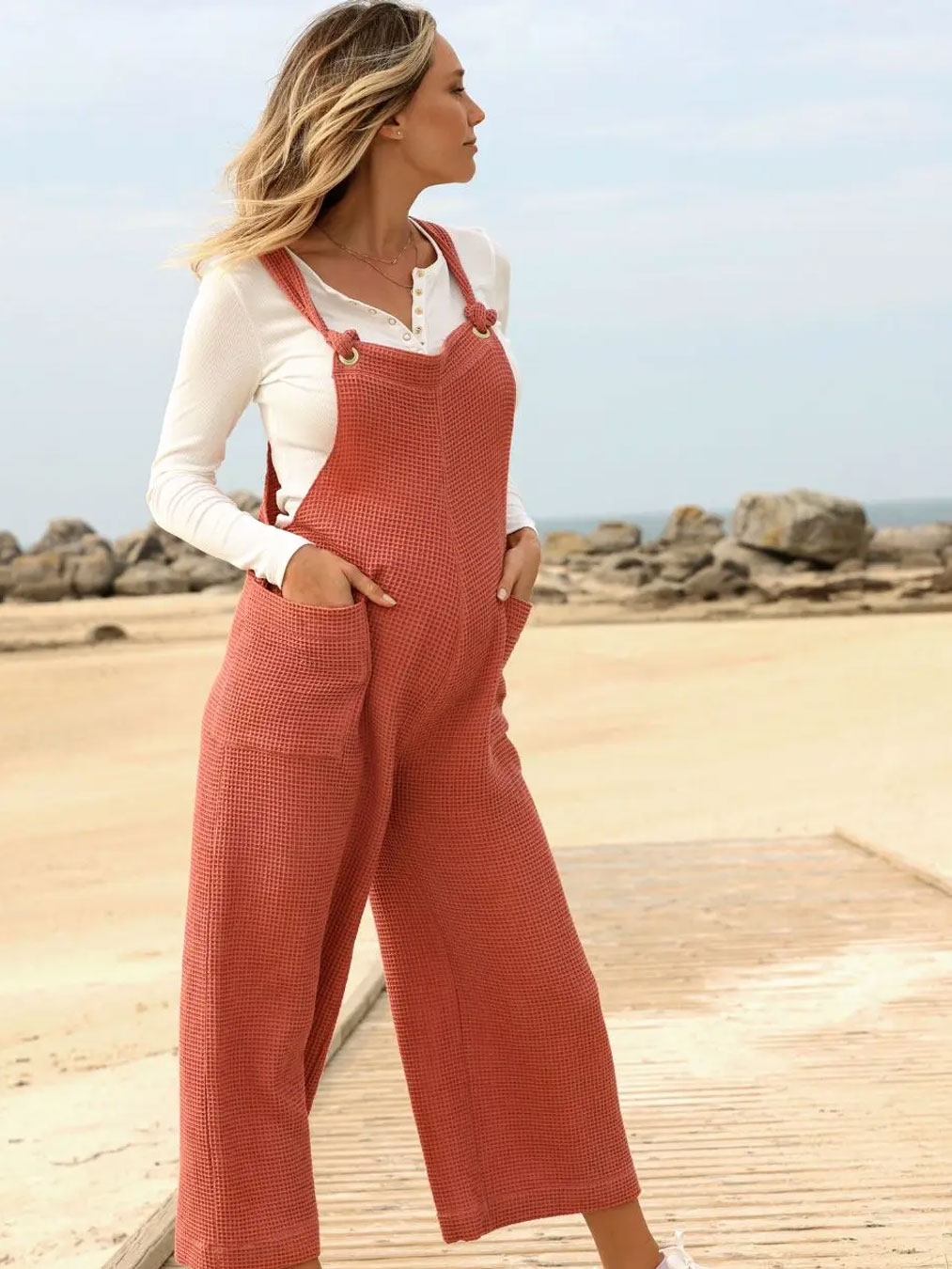 L'essayer, c'est l'adopter! La salopette de grossesse et allaitement Maya en coton nid d'abeille couleur terracotta est d'un confort inégalé et sera parfaite pour les beaux jours.