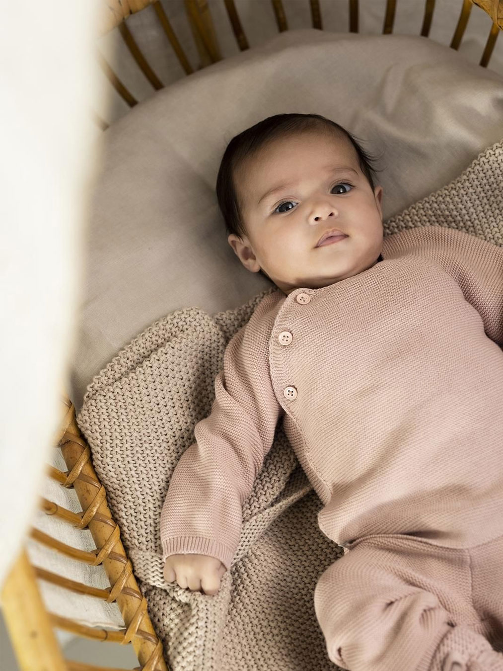 Irrésistible ce gilet en tricot rose smoke, à assortir avec un pantalon de la même collection ! Un essentiel pour habiller bébé dès la naissance.