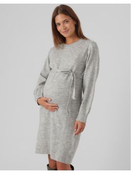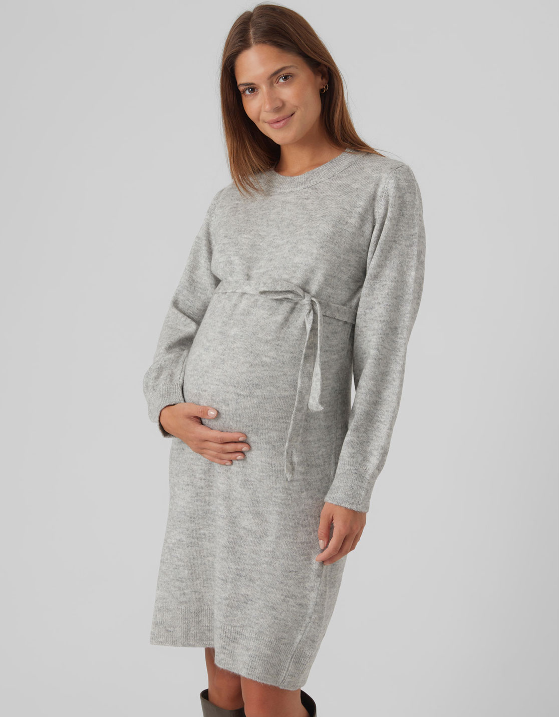Robe chinée grise douce et chaude de grossesse dont la coupe met en valeur la jolie silhouette de la femme enceinte, ajustée avec la ceinture.