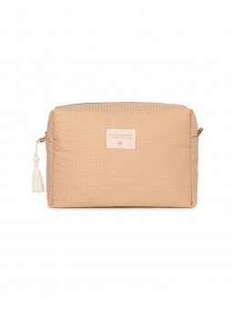 Trousse de toilette coloris nude en coton nid d'abeille fermée par un zip doré, pratique pour y ranger les affaires de bébé ou vos produits de toilette, peignes, crèmes. Imperméable, la grande trousse de toilette Diva offre également une large ouverture.