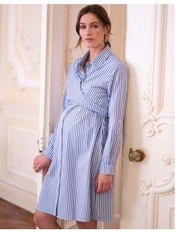 Superbe robe chemise à rayures pour future maman, la coupe parfaite qui sublime votre silhouette avec le ruban à nouer devant ou au dos.