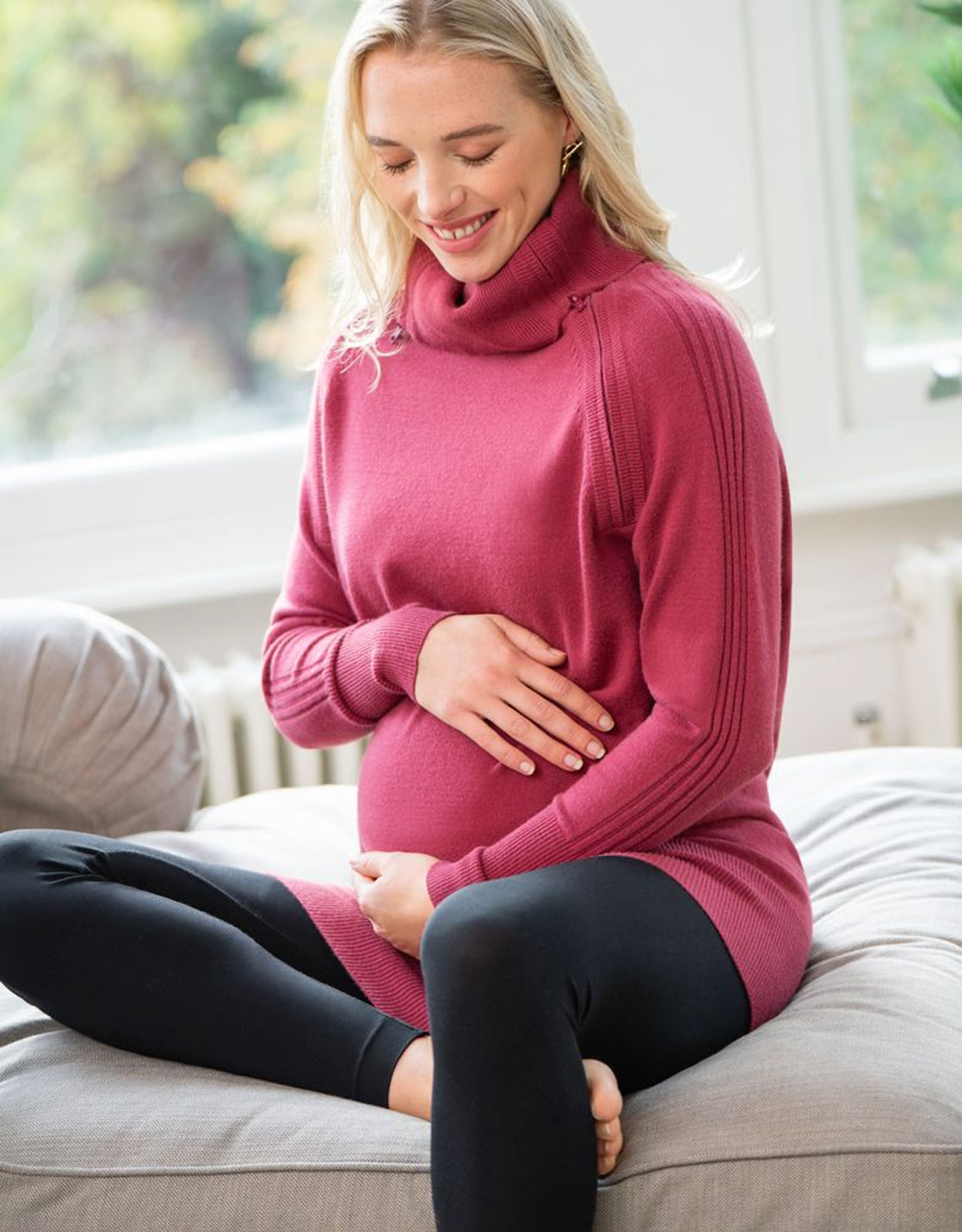 Facile à porter au quotidien avec un jean, le pull de grossesse framboise à col roulé est évolutif allaitement. Dézippez simplement le col et allaitez facilement bébé.