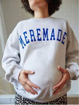 Sweat molletonné d'allaitement gris chiné Mère Made avec de larges lettres velours bleues pour un style loose et décontracté. Il est superbe porté avec un jean!